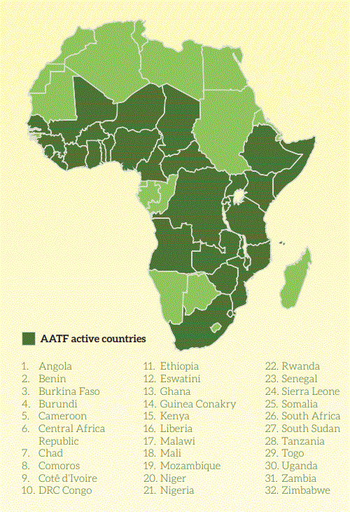 AATF is active in 24 countries of East, Southern and West Africa, currently addressing challenges bedeviling key staples in Sub-Saharan Africa that include maize, rice, cassava, cowpeas, bananas and potatoes.